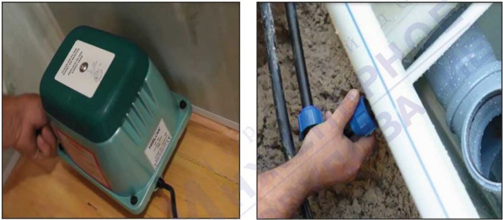 Компрессор установить в сухом отапливаемом помещении. Воздуховод от компрессора к установке проложить в траншее с подводящим канализационным трубопроводом с уклоном в сторону установки, во избежание провисания воздуховода с последующим промерзанием образовавшегося конденсата.