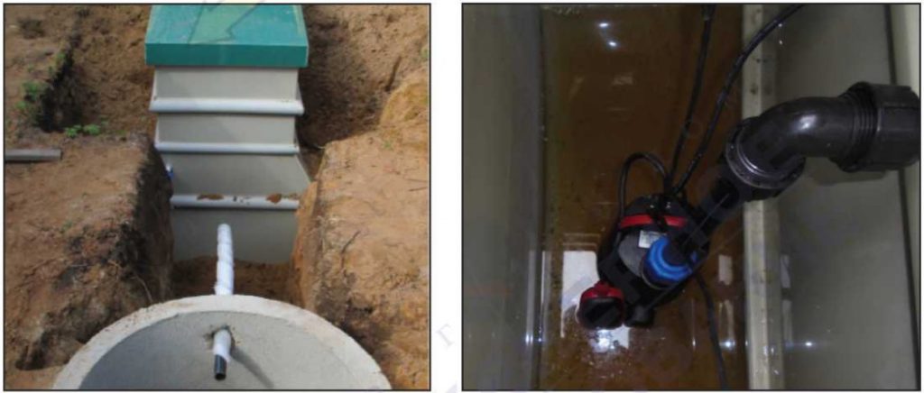 Отводящий самотечный трубопровод (модели П, ПМ) проложить аналогично описанному выше, его уклон принять не менее 0,5 см/1 пог.м. Отводящий утепленный напорный трубопровод (модели ПН, ПНМ) проложить на основании из уплотненного песка высотой100 мм с уклоном не менее 0.01 (1 см на 1 п.м.) в сторону насосной камеры для обратного оттока воды при отключении насоса. В насосный отсек разместить погружной насос со встроенным поплавковым выключателем и без обратного клапана.