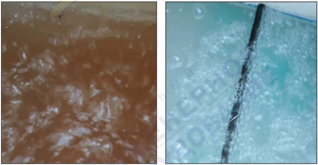 Отрегулируйте систему аэрации: активное бурление в аэротенке (1), в аэротенке (2) — пузырьки воздуха, отделяющиеся друг о друга.