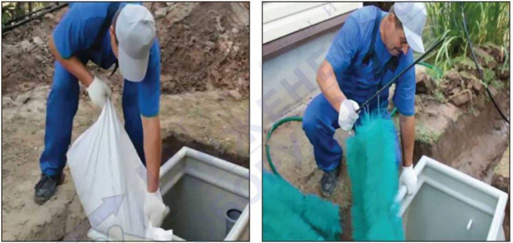 Нельзя в очистные сооружения сливать фруктовые и овощные очистки, твердую бумагу, строительный мусор и большое количество песка. Все эти вещества или совсем не разлагаются микроорганизмами или разлагаются недостаточно. Они плавают на поверхности или оседают на дно. Если говорить о песке и других тяжелых нерастворимых фрагментах, то они оседают на дно первой камеры, где спресовываются с остатками загрязнений, превращаясь в твердую массу. Это может стать проблемой при откачке. Ассенизационная машина с этим справится, а вот при откачке вручную фекальным насосом придется каким-то образом разбивать этот слой или залезать внутрь с лопатой.