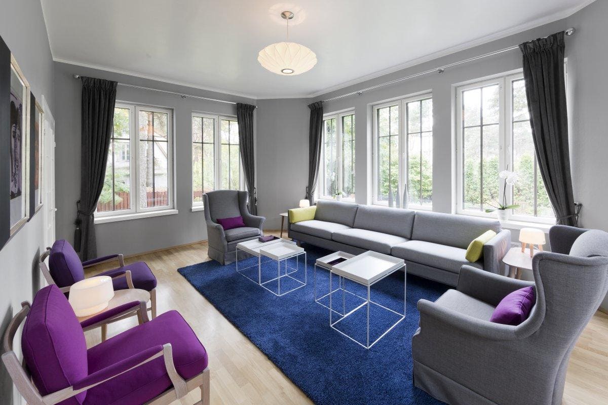 С серой мебелью и отделкой стен хорошо сочетаются и яркие цвета в небольших количествах. Это могут быть жизнерадостные жёлтые оттенки или сиренево-фиолетовые тона. Яркие акценты могут вноситься в виде обивки кресел или дивана, занавесей, деталей осветительных приборов, картинных рам.