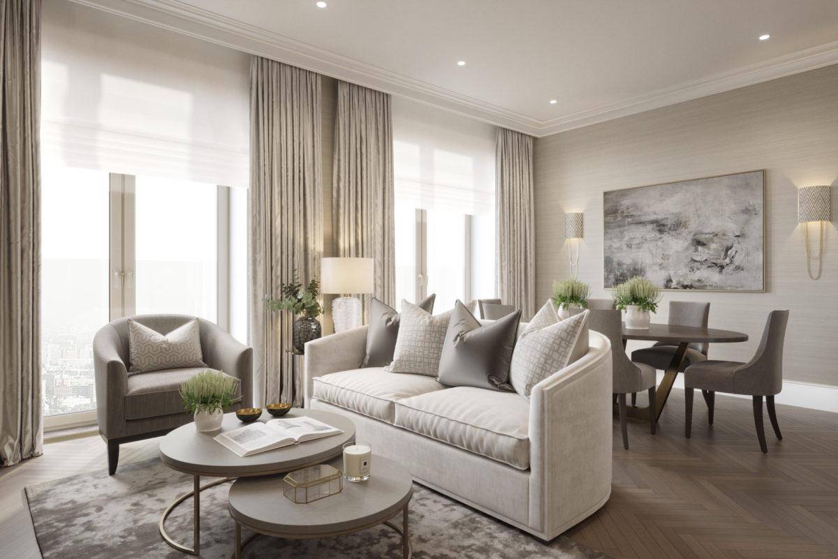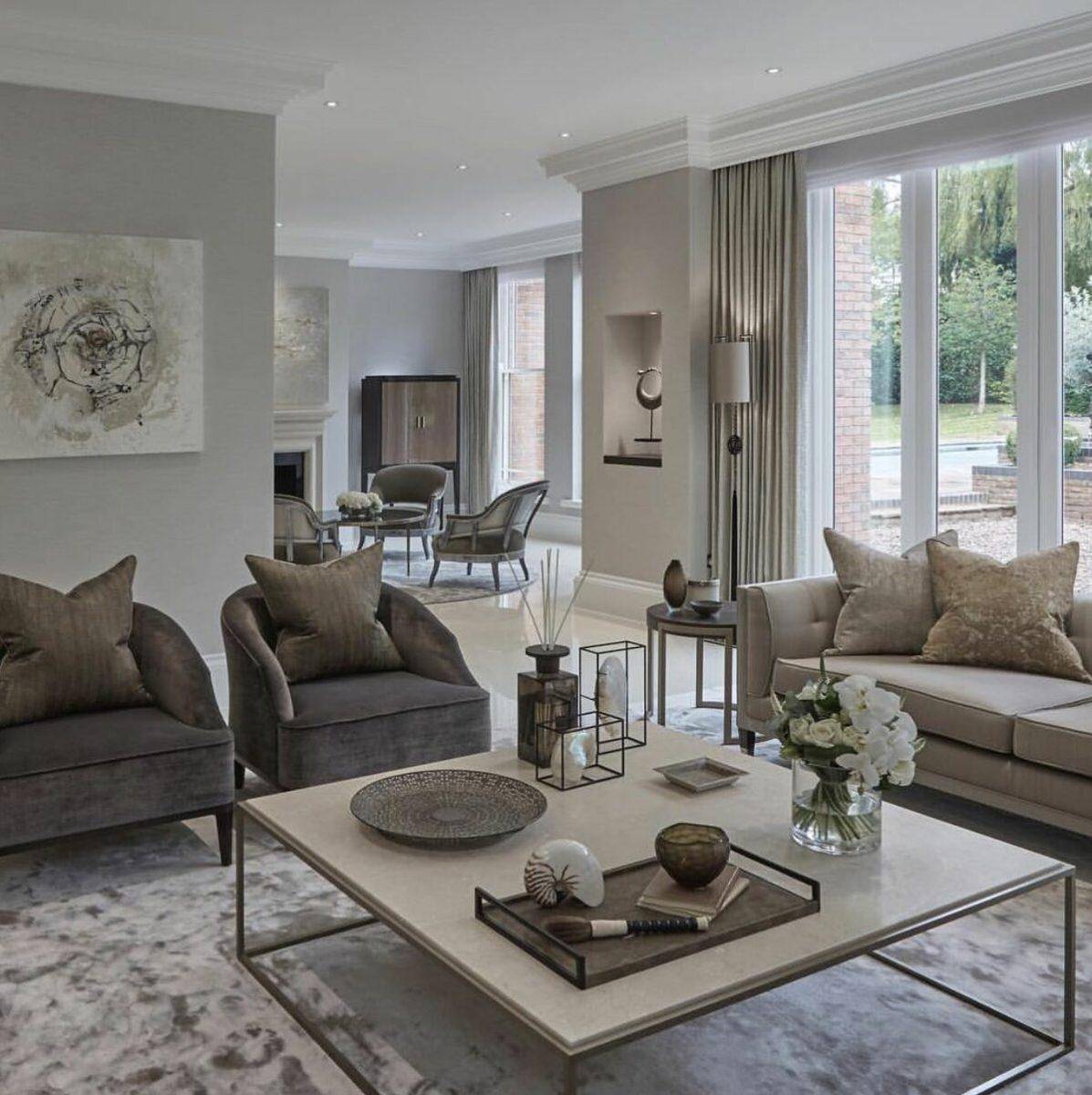 Интерьер гостиной в серо-бежевых тонах сочетает элегантность и уют. Такая цветовая гамма подходит как классике, так и или контемпорари. Если гостиная имеет небольшую площадь, лучше взять в качестве основного цвета беж, а в просторном помещении можно сделать доминирующим серый. С тёплыми серыми тонами хорошо сочетаются песочные и пудровые оттенки.