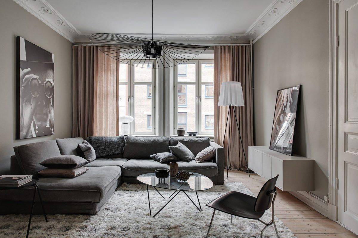 Темные оттенки серого в сочетании с бежевым, можно разбавить нейтральными цветам, белым, черным или коричневым. Прибавить комнате света можно с помощью светлых занавесок и больших окон. Также в серо-бежевую комнату можно добавить ярких акцентов, например персиковые подушки, ковер с желтым узором, большие цветы в горшках.