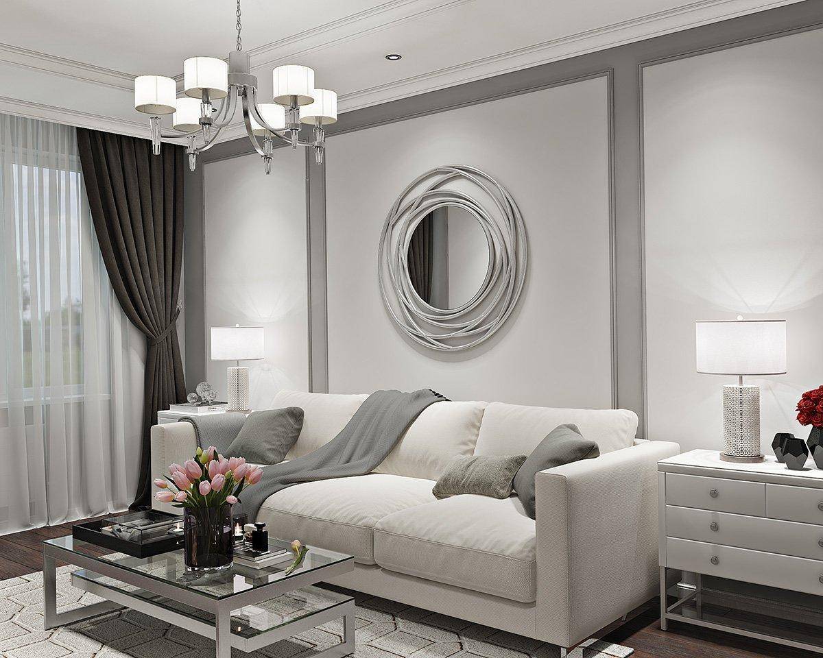 Ахроматические цвета дают гармоничное сочетание, не напрягающее глаза и хорошо подходящее как для малогабаритных, так и для более просторных комнат. Интерьер гостиной в бело-серых тонах может быть разным: для уютной камерной обстановки лучше подойдёт сливочный или молочный оттенок (т. е. не ярко-белый).