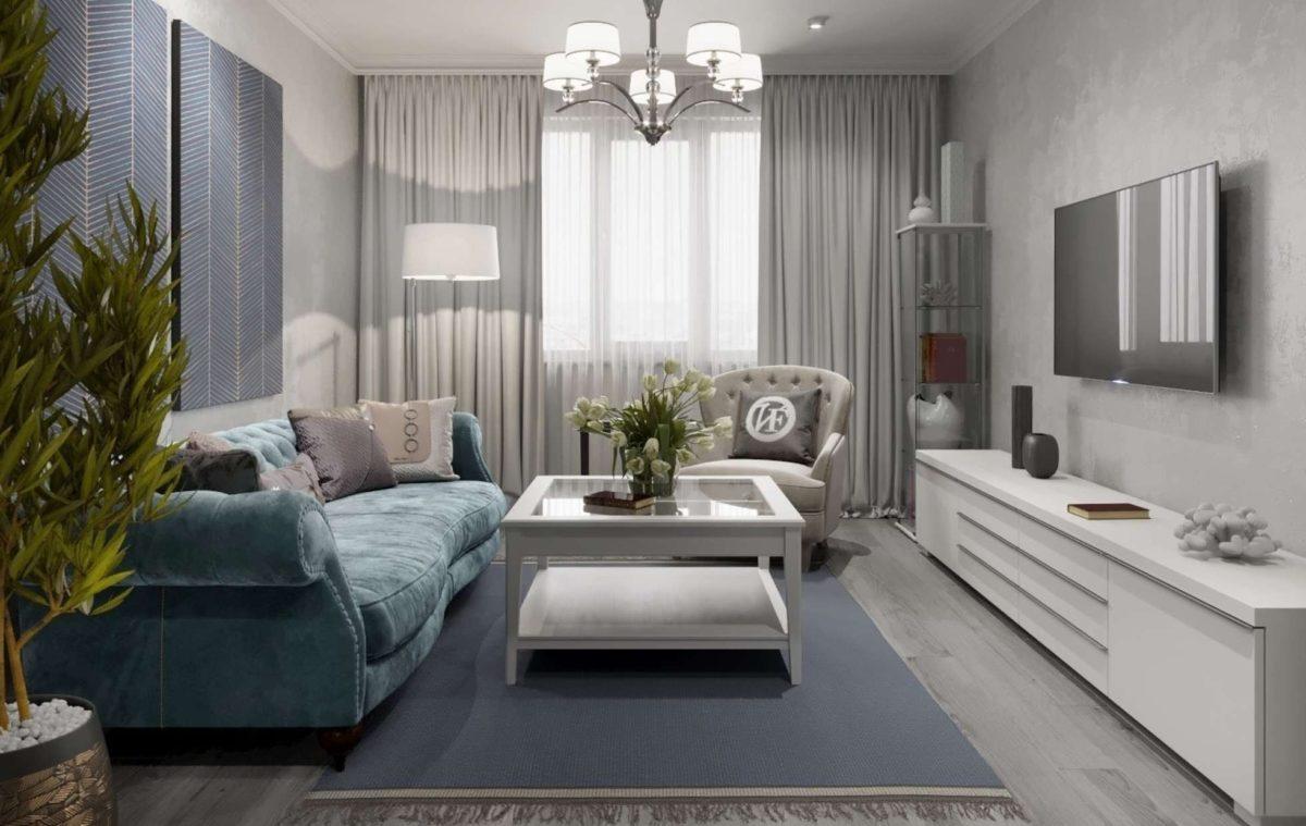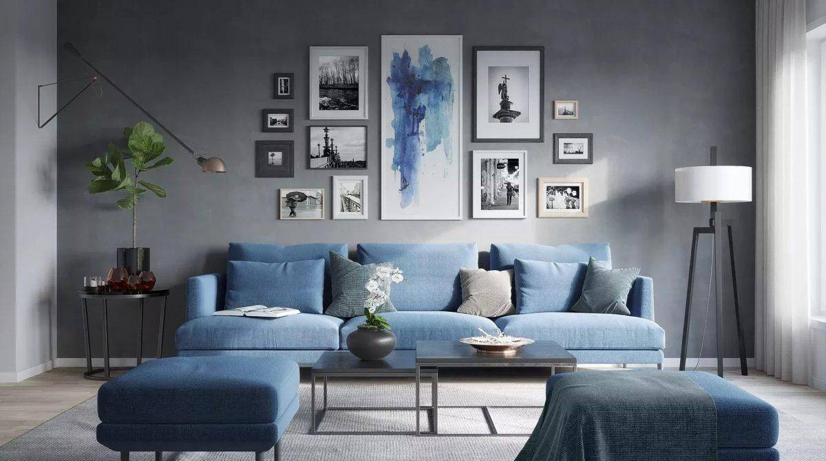 Для такого сочетания лучше использовать оттенки светлого серого и насыщенного голубого. Украсить комнату можно мебелью голубого цвета, шторами или другими декоративными элементами.