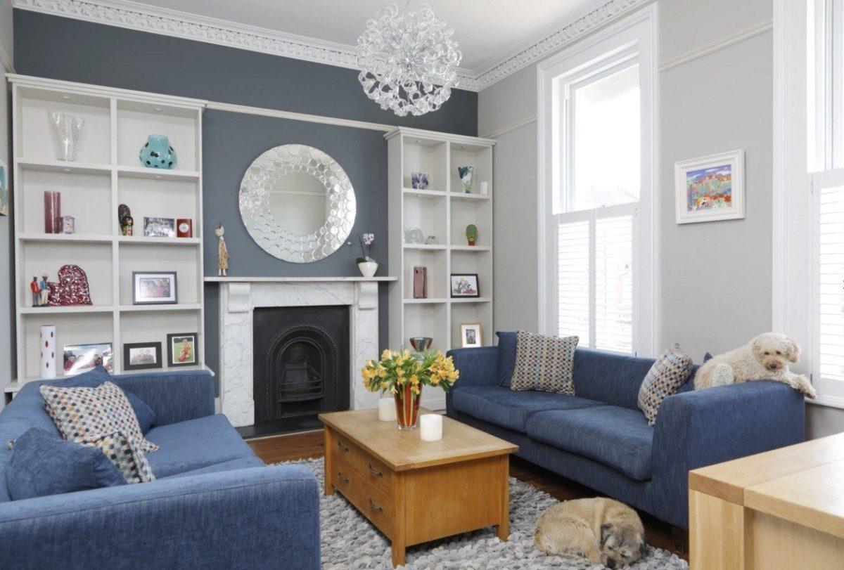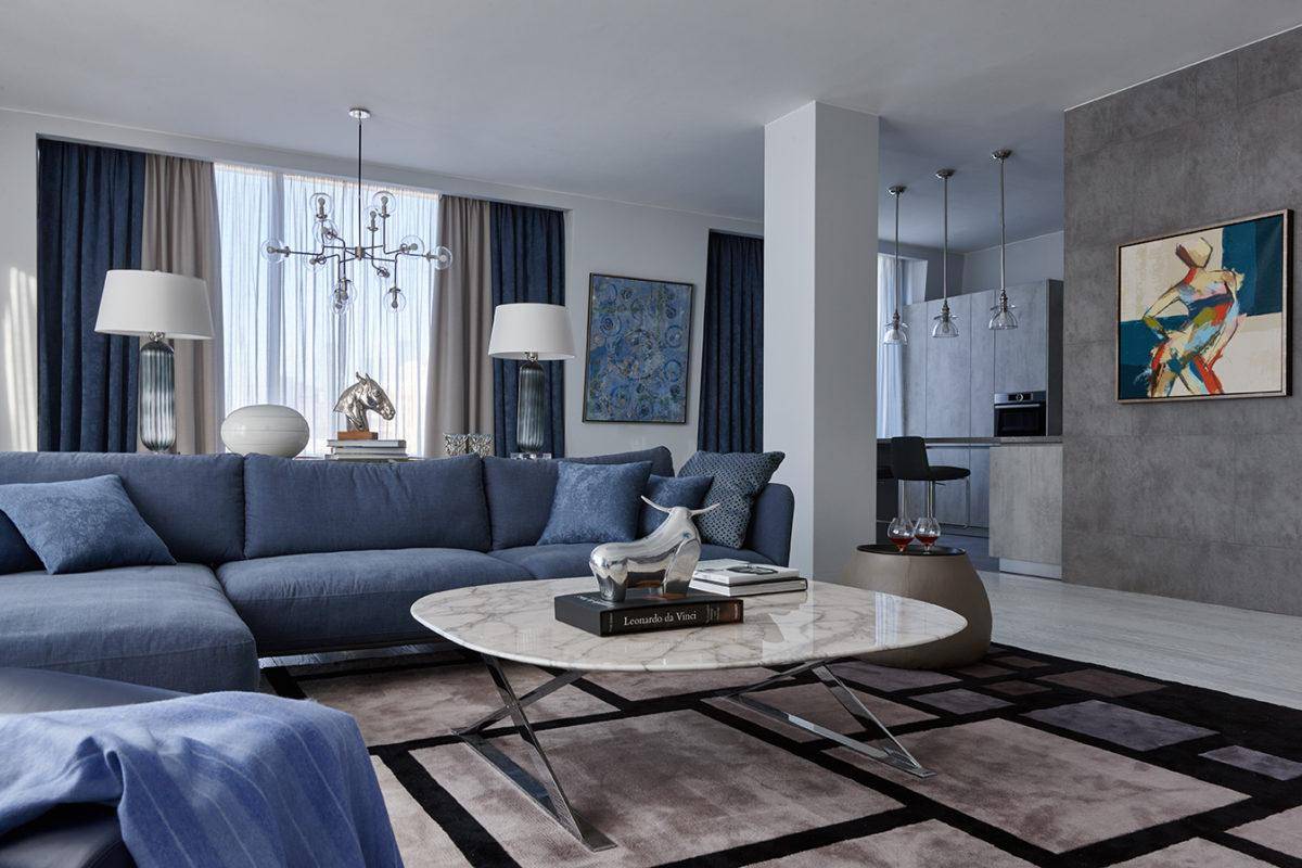 Такой интерьер смотрится расслабляющее и умиротворённо. Глубокий синий цвет хорошо подходит для обивки мягкой мебели, текстильного декора, штор. Если комната не слишком просторная, стены лучше сделать светло-серыми, используя краску или штукатурку. С серо-синей гаммой хорошо сочетается серебряный цвет, а также керамогранитная плитка под камень.