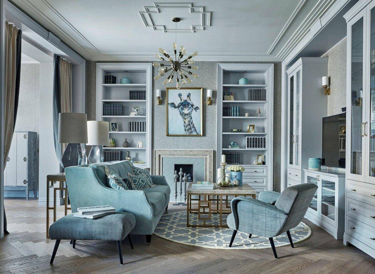 Это вариант для тех, кому комбинация с синим кажется сумрачной или излишне насыщенной. Голубой сочетается как с мягким дымчатым серым, так и с жемчужными оттенками, а также металлическими поверхностями.