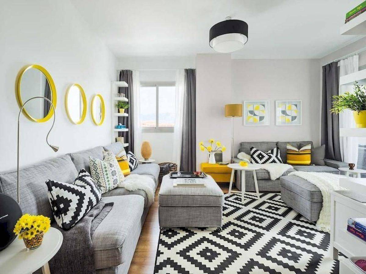 Желтый внесет каплю живого воздуха в унылость серого. Благодаря данному комбинированию можно создать неординарный образ помещения. Серо желтый можно разбавить нейтральными оттенками черного и белого. На серых стенах хорошо смотрятся желтые декоративные элементы — подушки, шторы, ковры, картины.