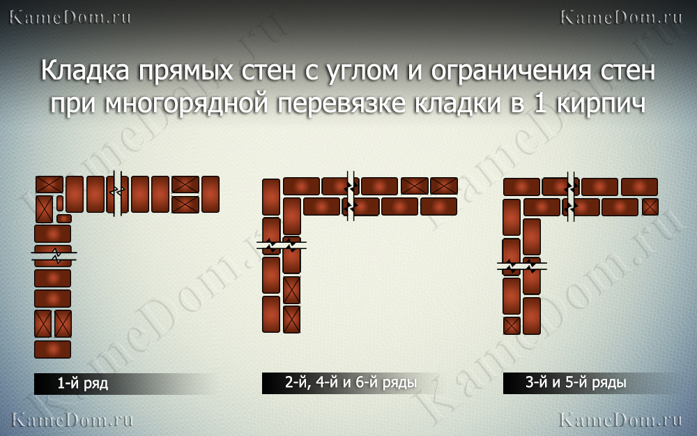 При многорядной системе перевязки чередование уложенных ложковой частью наружу рядов с теми, что уложены тычковой частью наружу, пойдет не через один, а несколько ложковых. Для такой системы имеются определенные правила чередования. Для кирпичей одинарного типа используют кладку в 6 однородных рядов, которые перевязывают тычковым рядом.