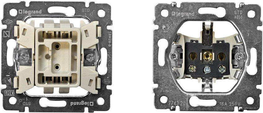 Конструкция проходного выключателя с двумя клавишами напоминает два независимых друг от друга одноклавишных выключателя, но с шестью контактами. Внешне проходной от обычного выключателя не отличить, если бы не специальное обозначение на нем.