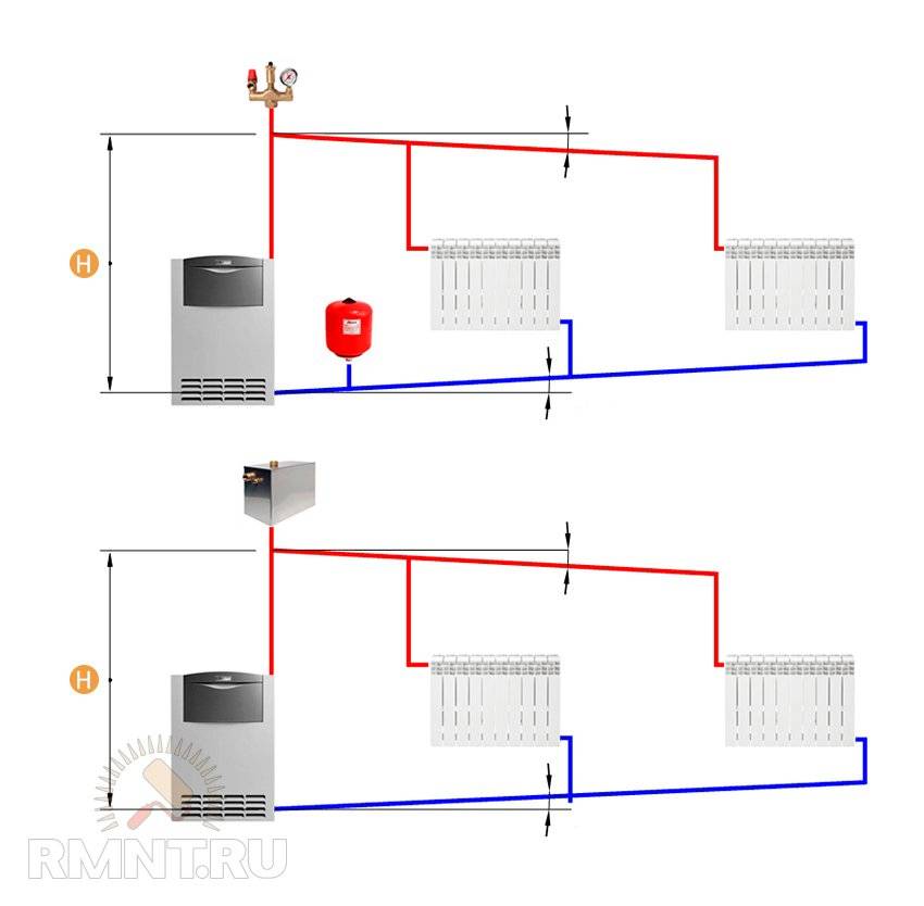 Отопление с естественной циркуляцией. H – разница уровней линий подачи и обратки, определяет напор в контуре отопления