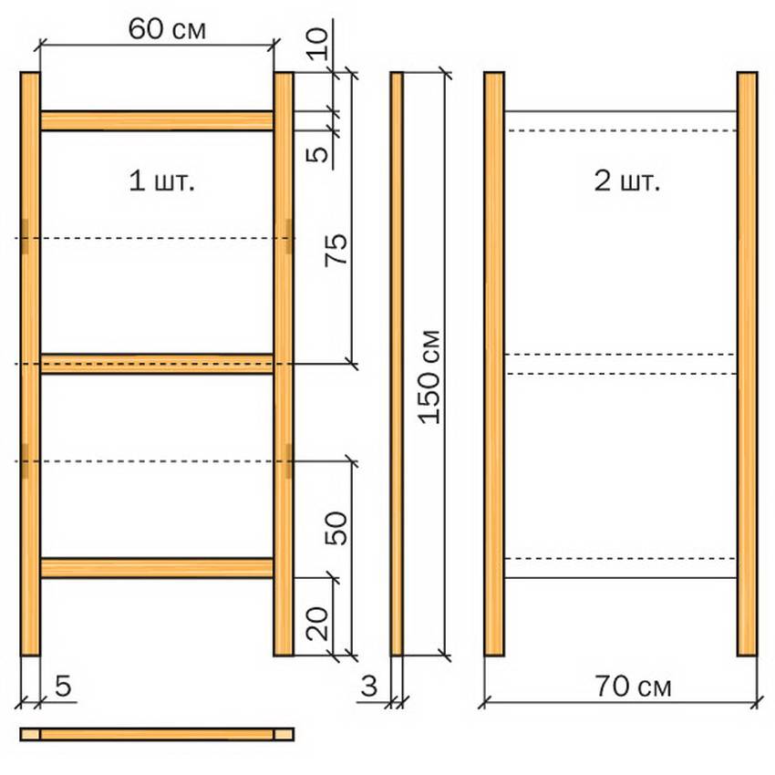 - деревянные сосновые рейки квадратного или прямоугольного сечения – 6 штук длиной 160 см и 6 штук длиной 50 см,