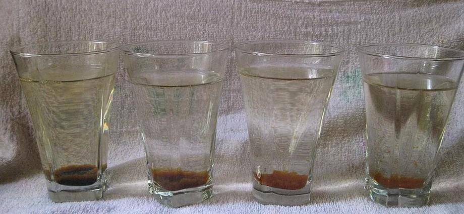 - Простое Fe(0). Оказавшись в водной среде, это железо трансформируется в Fe(III). В таком виде оно выпадает в осадок и образует слой ржавчины, который легко определить визуально.