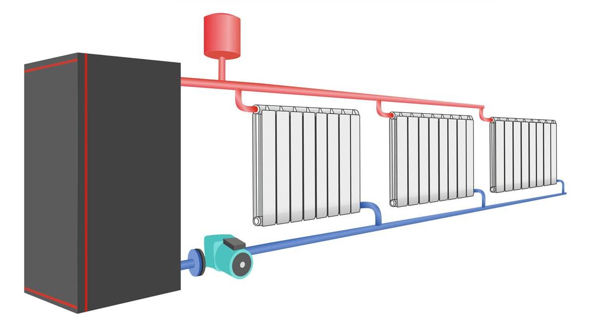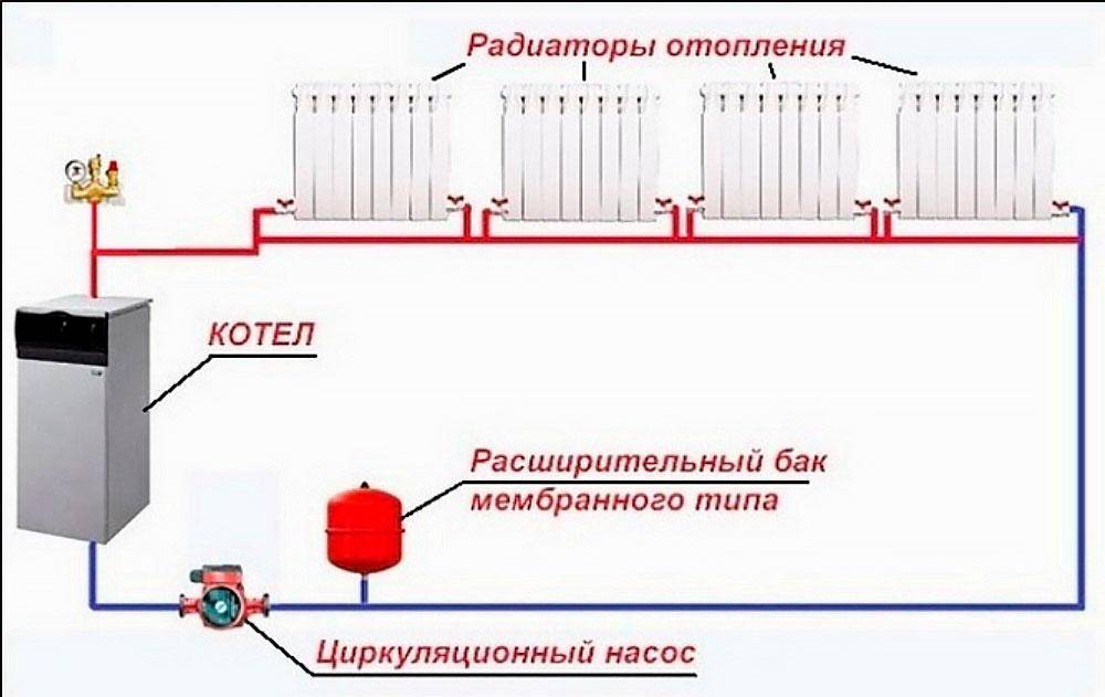 Принудительная циркуляция более распространенная, так как она не зависит от характеристик используемой трубы. Теплоноситель поднимается наверх посредством установленного насоса.