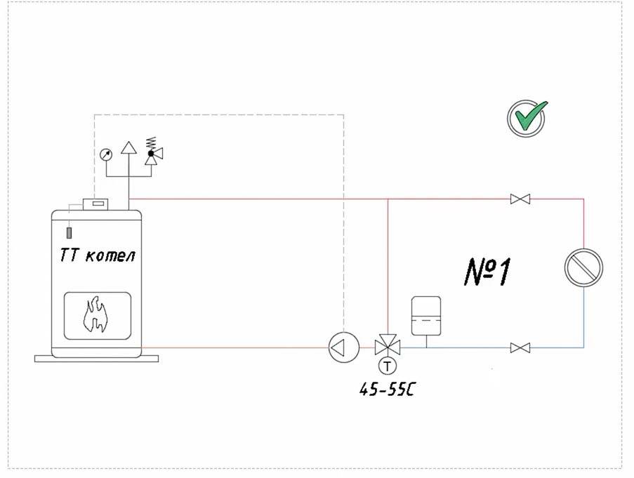 Недостаток схемы в том, что в систему может подаваться теплоноситель температурой не менее 55 градусов. Для осени или весны эта температура уже является некомфортной, и понизить ее никак не возможно, так как используется трехходовой термостатический клапан. При 45 градусах ваш котел будет просто стоять в режиме ожидания и топливо просто будет расходоваться впустую. Кроме того, дрова в режиме тления опять-таки способствуют образованию смол на стенках котла и снижению его КПД.