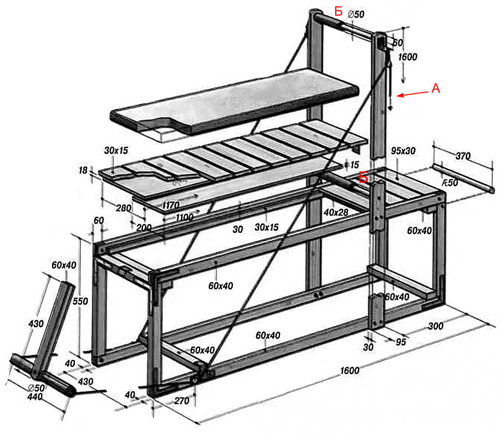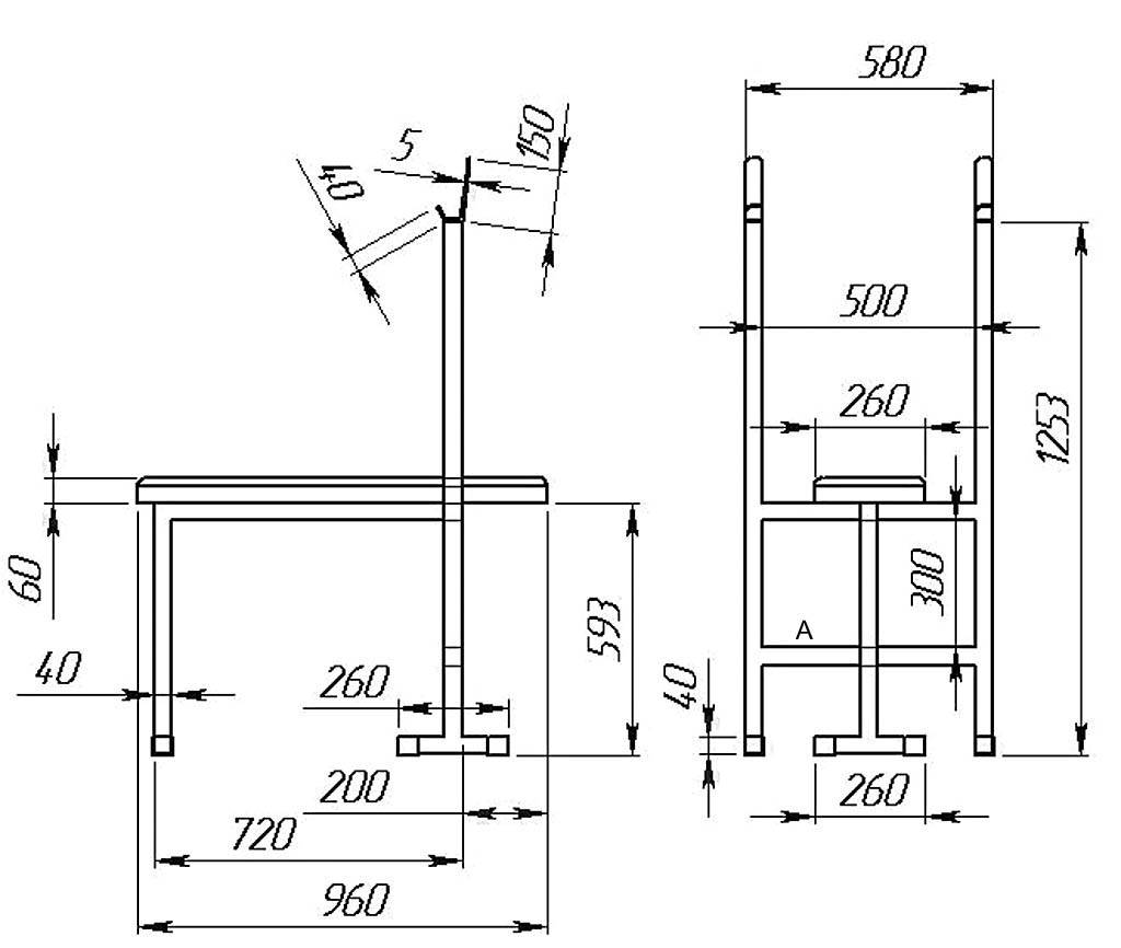 Далее на рис. – компактная силовая скамья со стойками для штанги. Упражнения на ней делают в основном сидя.Можно также качать пресс, глубоко прогибая спину. В таком случае упорами ног будет поперечная балка А, и тогда ее нужно обтянуть чем-то мягким или надеть резиновую муфту. Материалы – профтруба 40х40, а держатели штанги из стальной полосы толщиной от 6 мм.