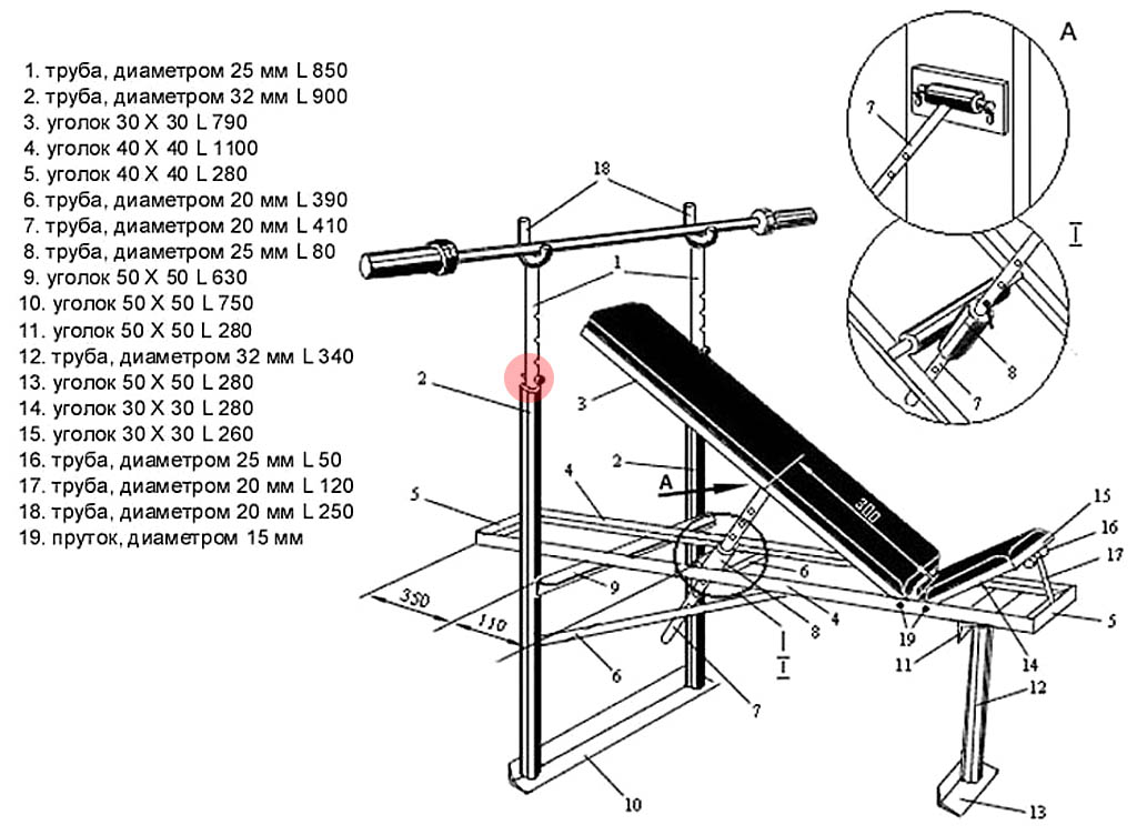 Обратите внимание на узел, выделенный красным. Это – наиболее простой и надежный для исполнения в домашних условиях способ фиксации стоек штанги