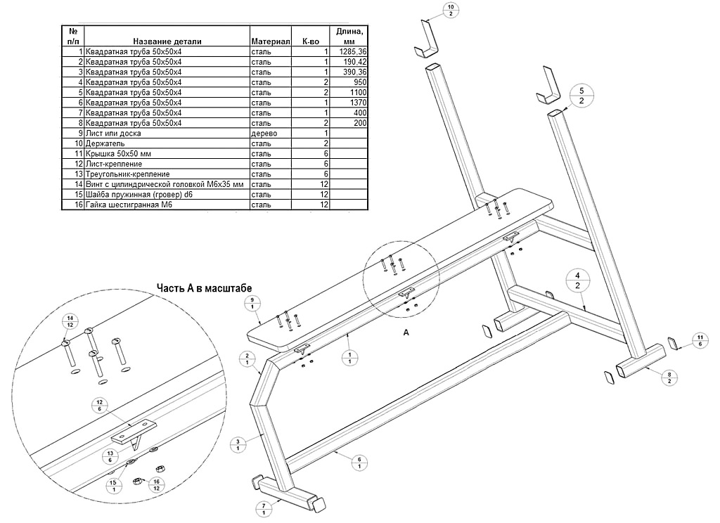 Наконец, далее на рис. – чертежи и спецификация элементов на полнофункциональный домашний тренажер со скамьей-трансформером для жима и пресса