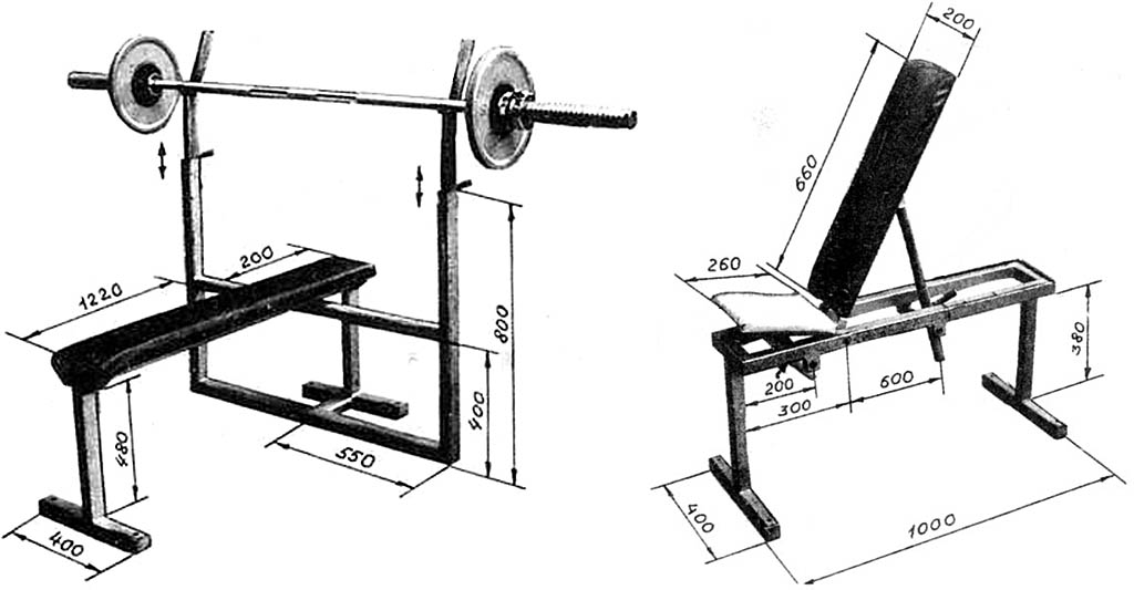 Как намертво связать скамью-«ипполитовку» со стойкой для штанги, превратив в достаточно компактный 4-опорный тренажер, показано слева на рис. Там же справа – размеры и конструкция скамейки-трансформера под ту же раму. Основной материал там и там – профтруба 40х60. О фиксаторах стоек с держателями штанги вспомним ниже.
