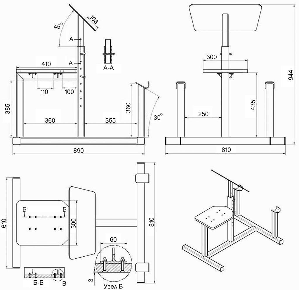 Чертежи можно составить самостоятельно либо найти готовые в открытом доступе. На эскизе должны отображаться все конструктивные особенности будущего изделия, размеры каждого элемента. При необходимости исходные параметры меняют в соответствии с индивидуальными требованиями. Спортсмены, которые ходят в тренажерный зал и занимаются на профессиональном оборудовании, смогут снять мерки и на их основе разработать собственную схему.