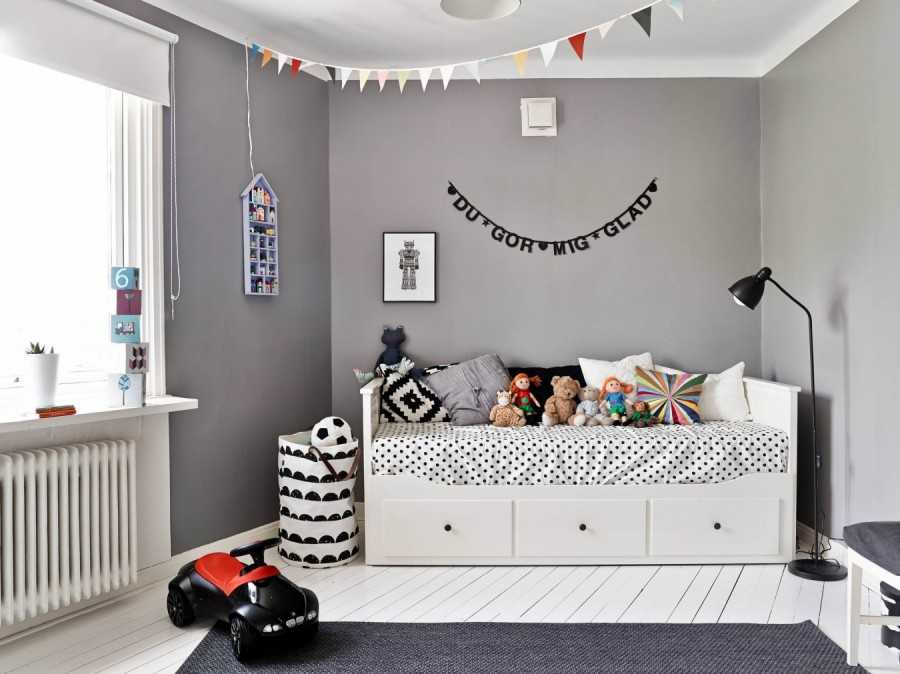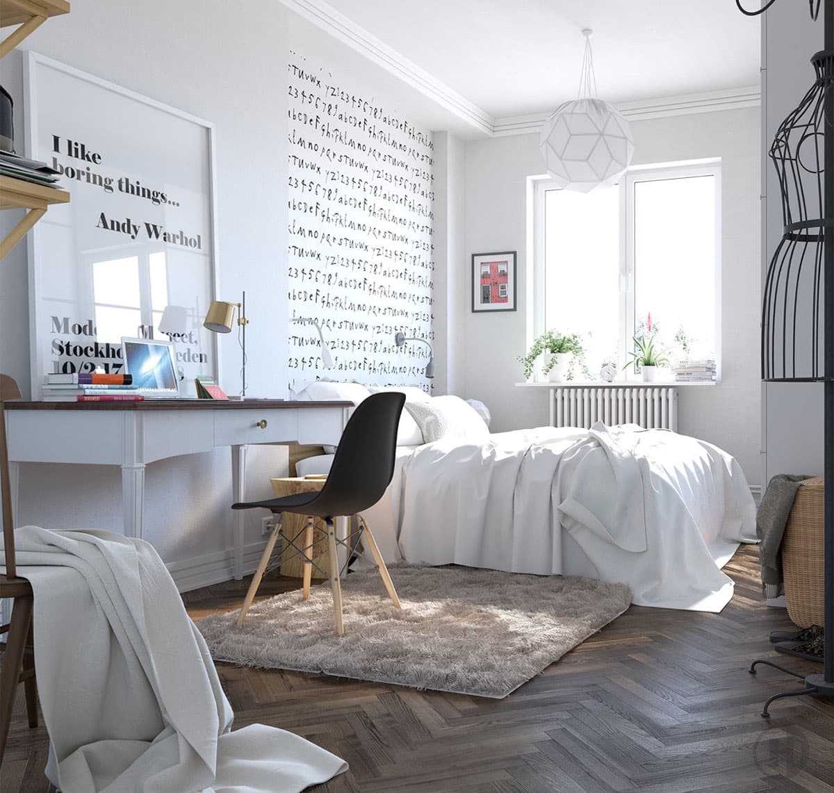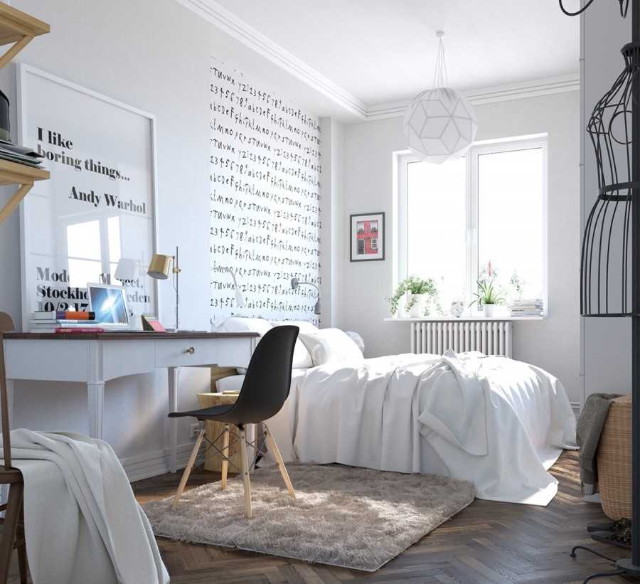 Традиционный оттенок стен для комнаты в скандинавском стиле – это белый. Он является отличным фоном, в который вписывается любая мебель и предметы интерьера. Кроме того, белые стены обладают замечательным эффектом визуального расширения пространства, что делает их незаменимым решением для малогабаритной квартиры.