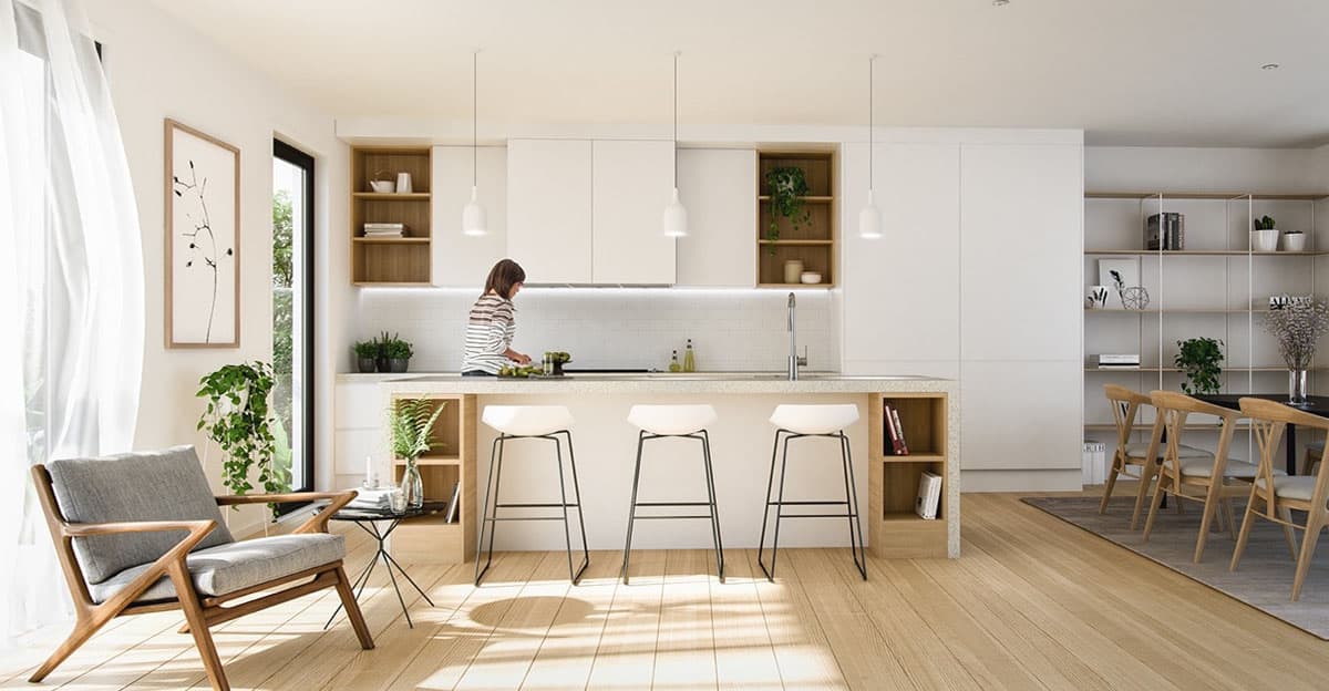 Для квартиры такой стиль идеально подходит благодаря своей лаконичности и простоте. Светлая гамма холодных оттенков позволяет визуально расширить даже самое маленькое пространство, а вместительные системы хранения идеальны для городских квартир без кладовок и хозяйственных помещений.