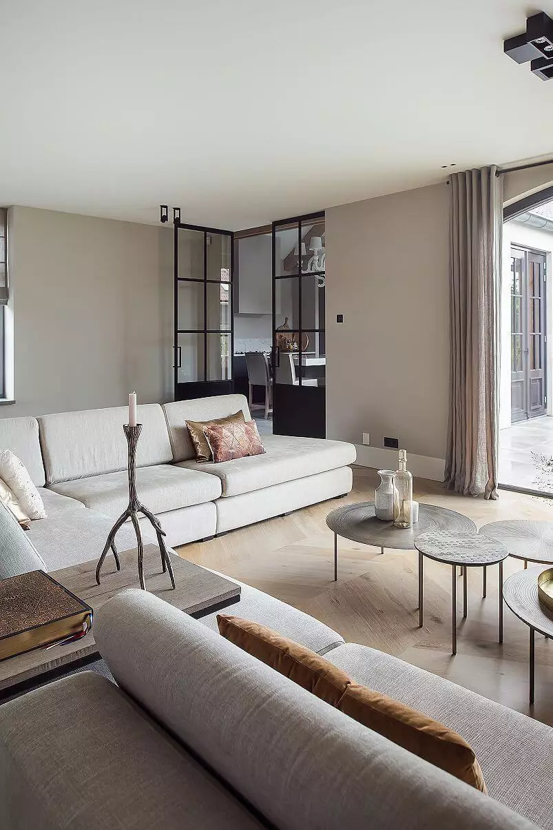 Здесь не используются яркие акценты (или используются в ограниченном количестве), зато часто можно встретить акцентные детали черного цвета.