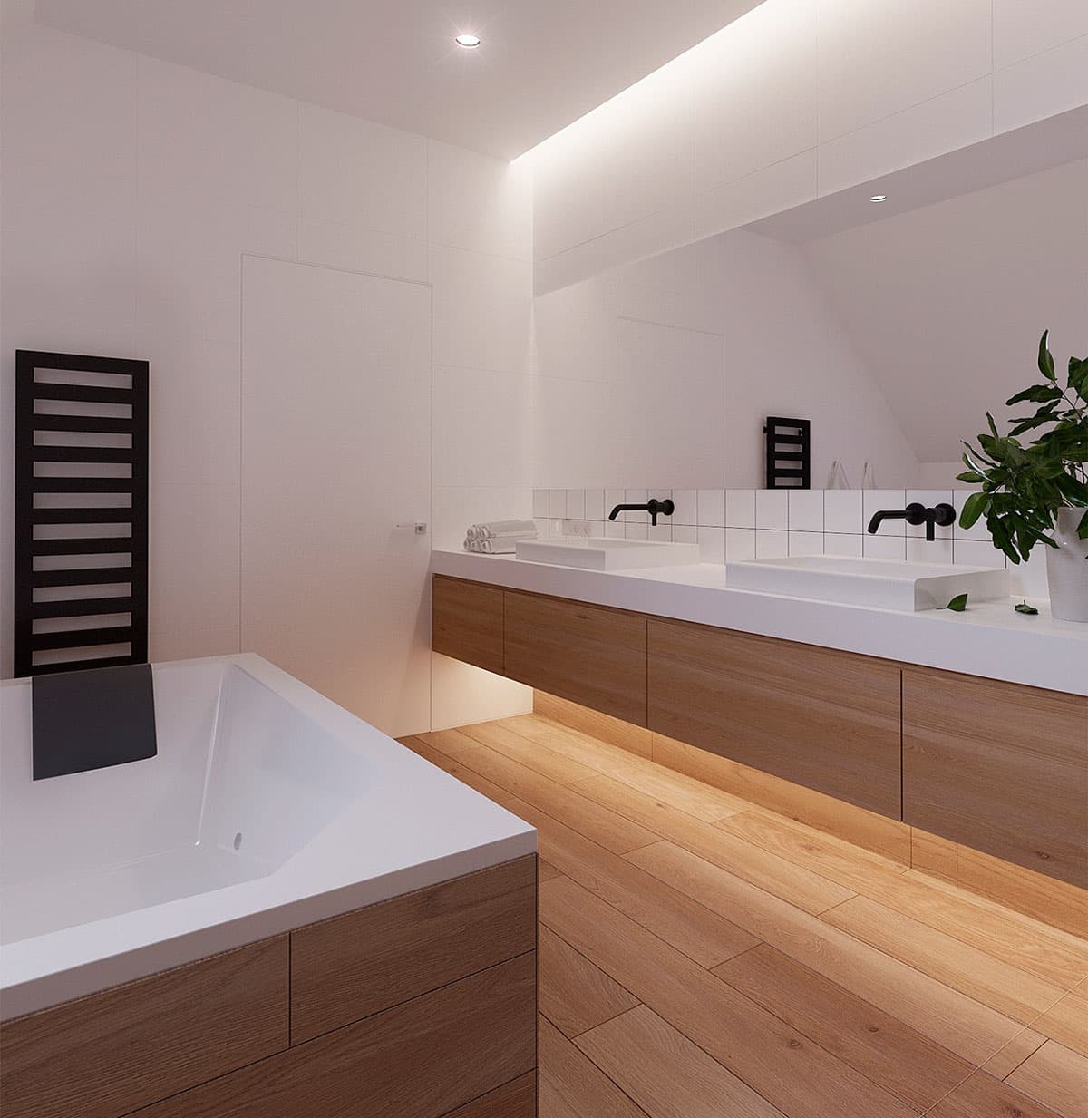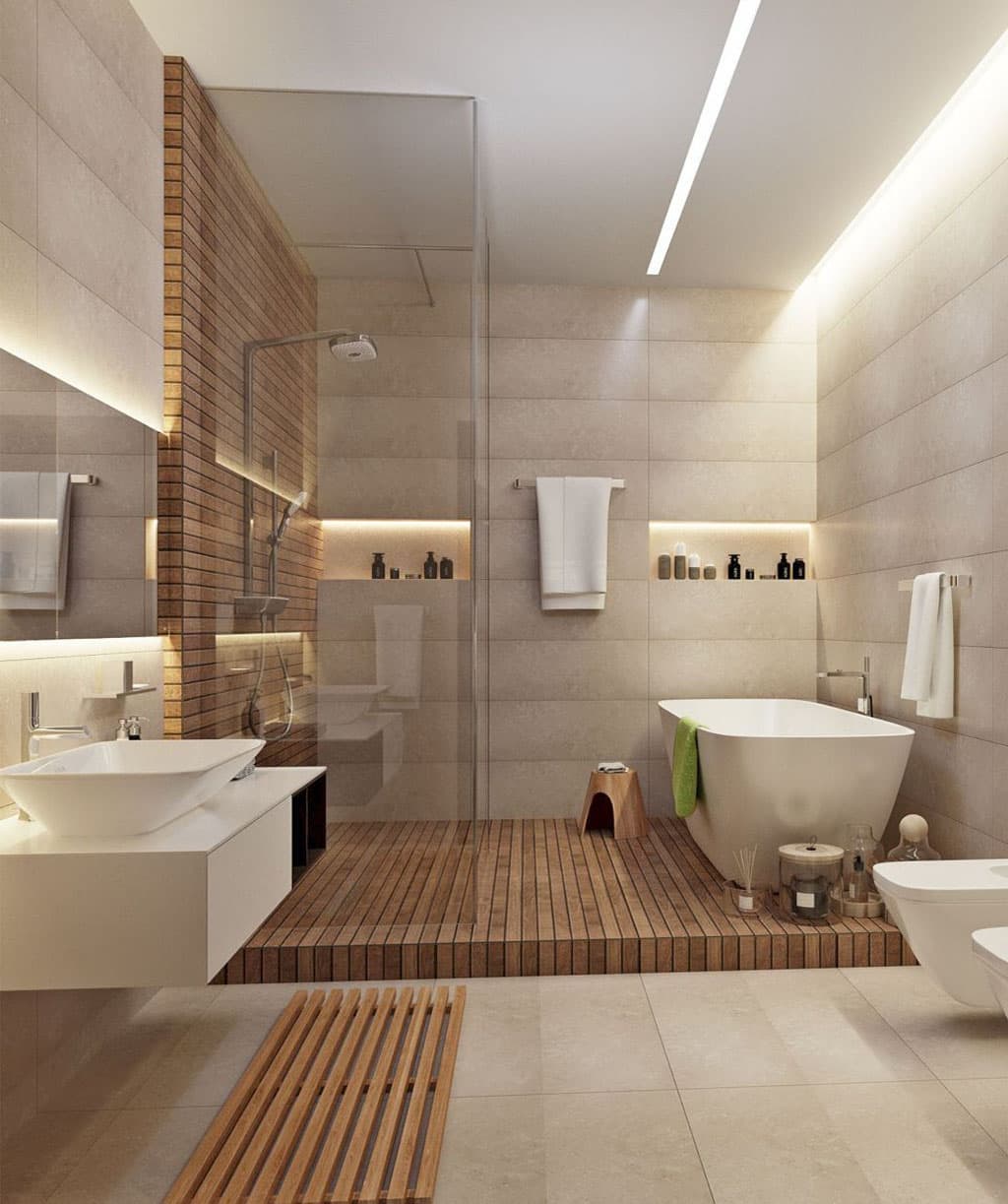 Особенность ванной в этом стиле – наличие деревянных функциональных или декоративных элементов.