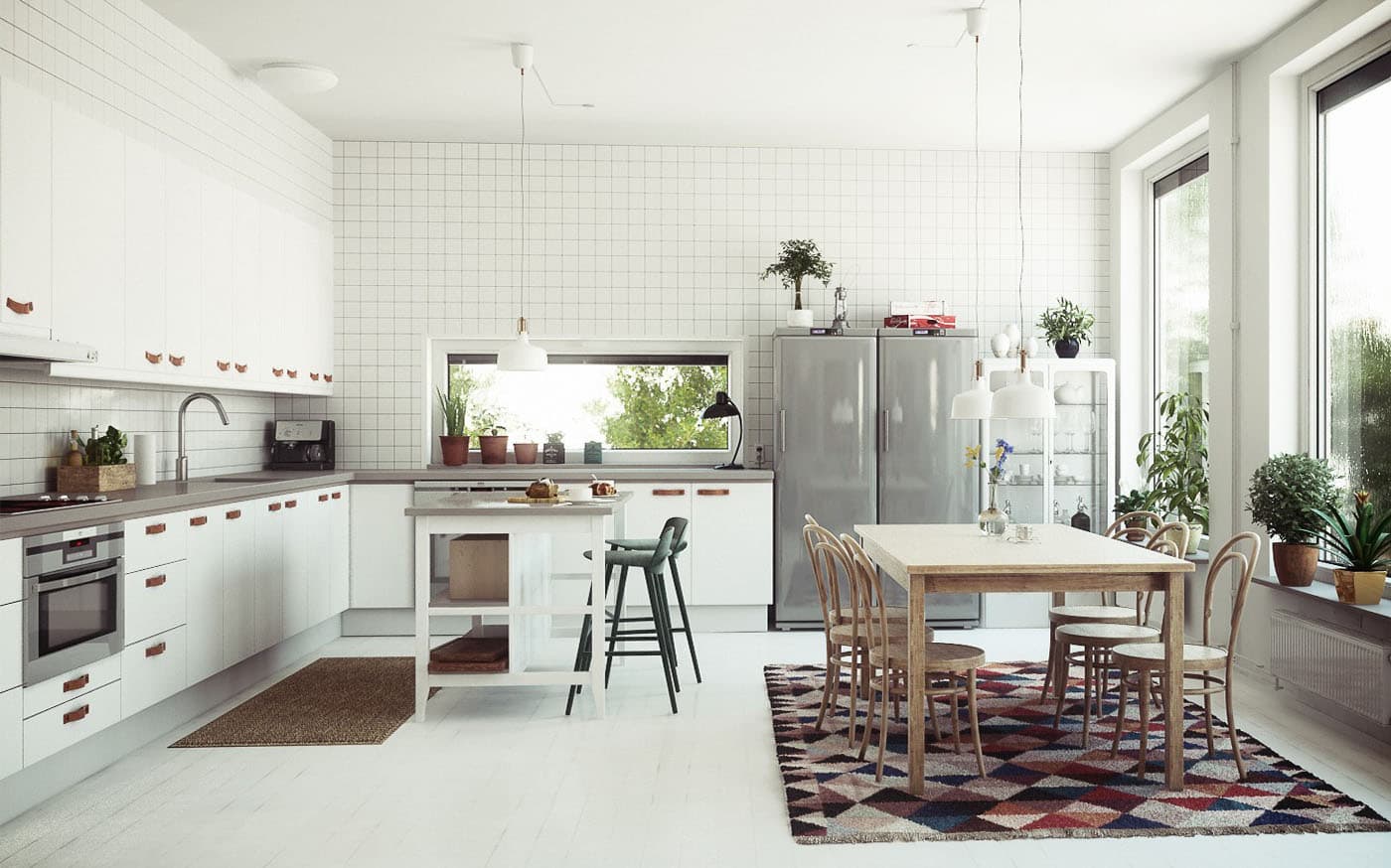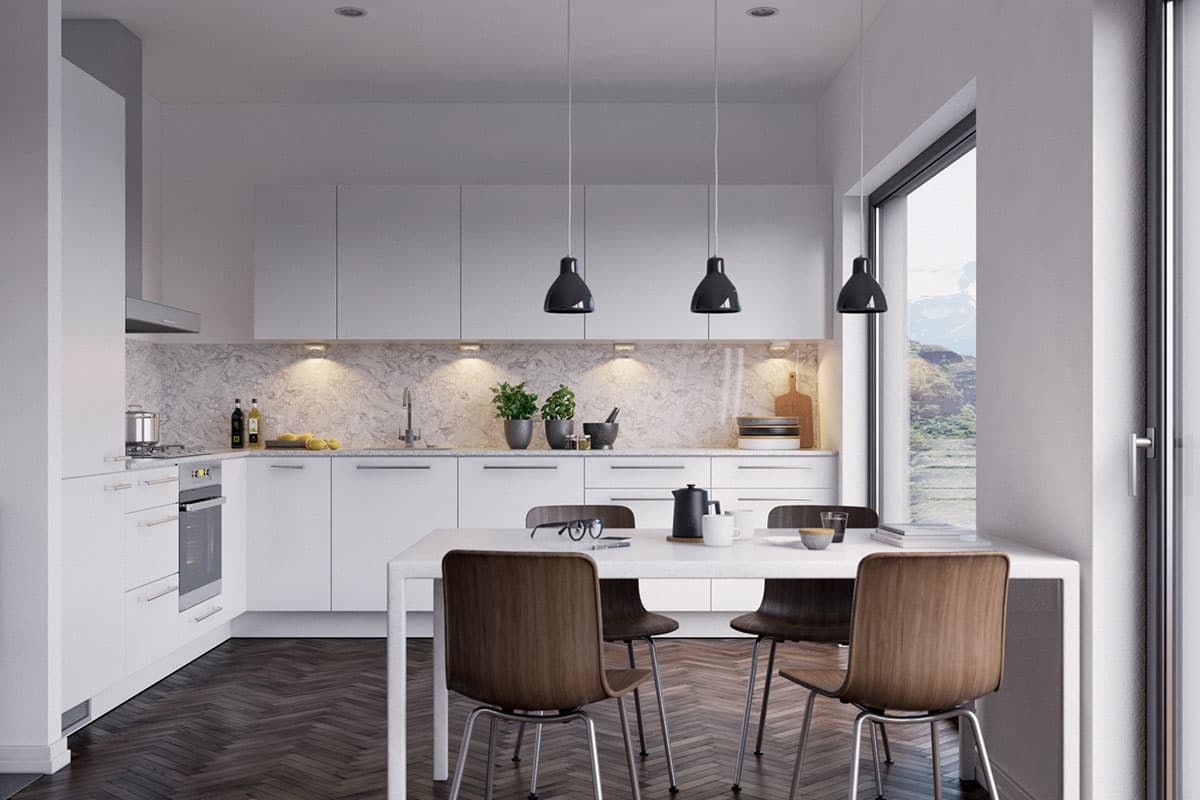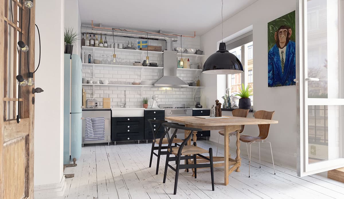 Светлый и просторный скандинавский интерьер отлично подойдет для малогабаритной кухни. Зрительно расширить ее площадь и добавить света помогут белые стены и лаконичная мебель четких форм. Натуральные природные материалы и фактуры сделают комнату комфортной и внесут в нее домашний уют.