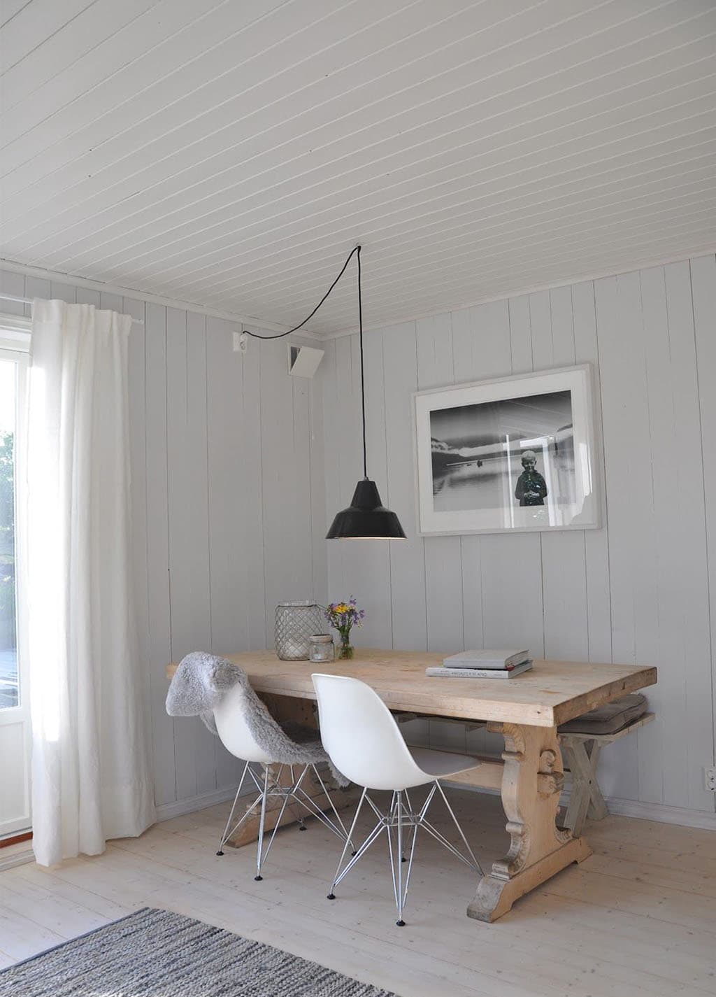 Штукатурка и краска — это первые варианты, которые следует рассмотреть для создания основы скандинавского интерьера. Гладкие стены, окрашенные светлой краской с высоким коэффициентом светоотражения – что может быть уместнее? При этом допускаются более сложные решения – оштукатуренный кирпич, обшивка деревянными панелями или вставки из легкого искусственного камня. Скандийские обои используются не часто. Это непрактичное решение в аутентичных интерьерах Северной Европы с ее повышенной влажностью.