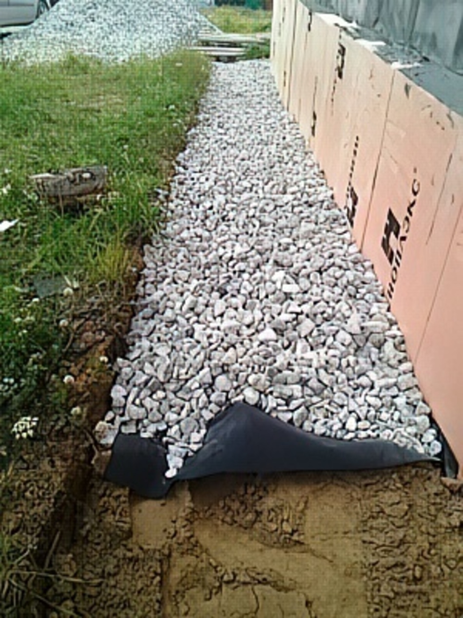 - Если планируется установка дренажной системы, то она укладывается вплотную к полученному «гидрозатвору».