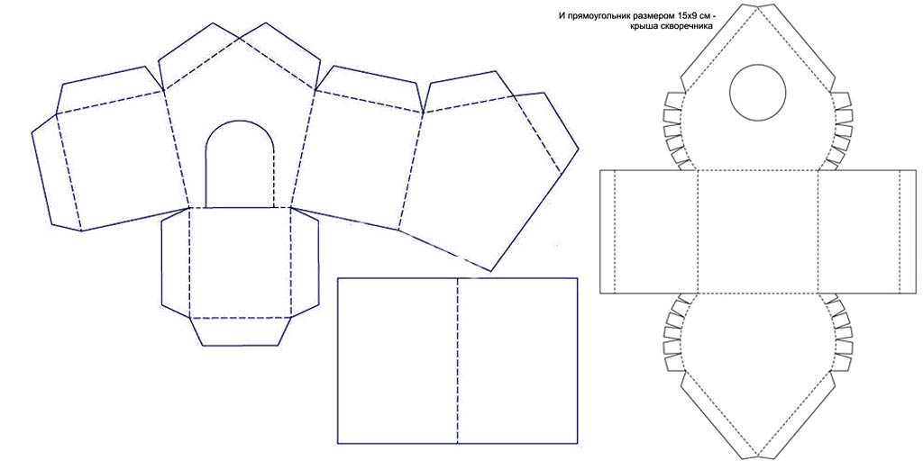 Первое, что приходит на ум – бумага. Бумажные скворечники придумали птицеводы-любители в США, оборудование для содержания и разведения домашних животных там очень дорого. Дома, в вольере, в бумажных дуплянках действительно, удается разводить волнистых попугайчиков или, скажем, красных кардиналов. Но говорить об уличном бумажном скворечнике всерьез нельзя: материал абсолютно нестоек. Тем не менее, даем на рис. пару выкроек скворечников из бумаги: слева – отвлекающе-заменяющего для четвероногих оккупантов, а справа – птичьего. Они пригодятся нам чуть ниже, а при случае по тем же выкройкам можно сделать бонбоньерку или подарочную коробочку.