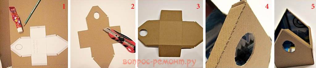 Чтобы получить короб, потребуется склеить все стенки скворечника встык под прямым углом. Для того чтобы короб высох, его следует обмотать нитками. При изготовлении крыши домика обязательно предусматривают припуск снаружи. Увеличить срок службы изделия можно, оклеив его бумагой с ламинированным покрытием.