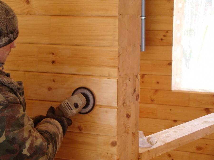 Оптимально проводить такие работы до монтажа окон и дверей, т.к. процесс шлифовки очень пыльный. По этой же причине работники должны использовать респираторы и защитные очки. Обработке подвергается только сухая поверхность пиломатериала, а также торцы бруса. В этих целях используют специальные шлифовальные машинки, а также шкурку с различной зернистостью, которую подбирают исходя из текущего состояния поверхности стены.