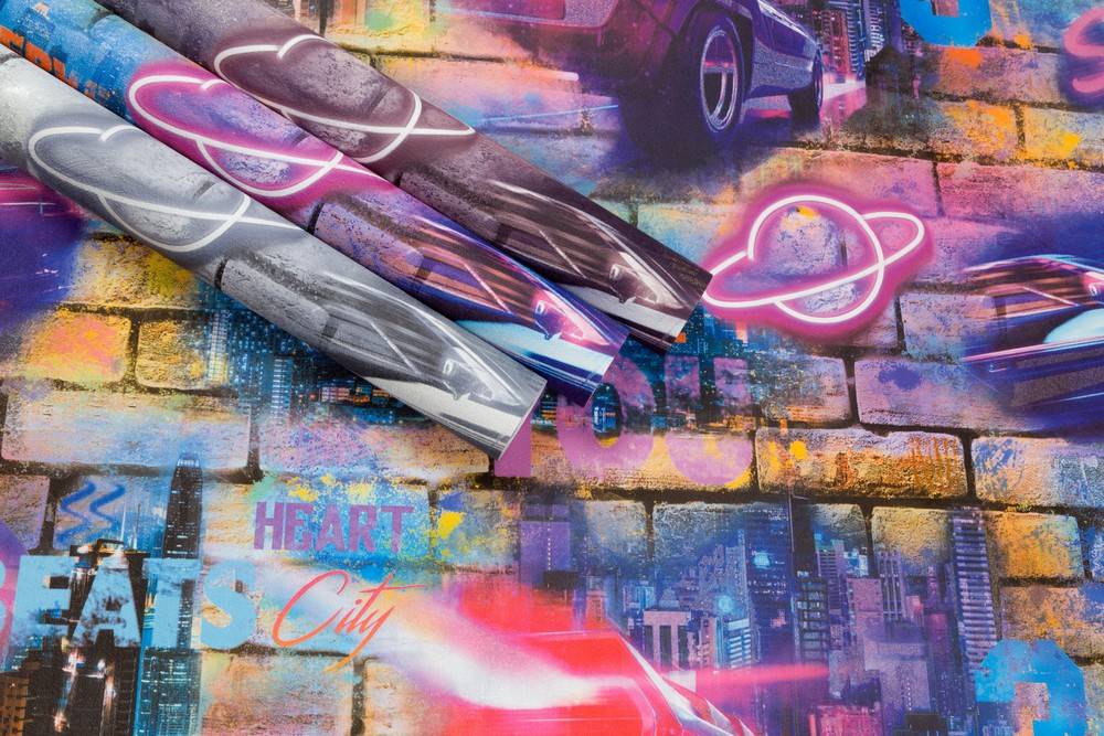Первые часто используют для оформления одной стены, ее нижней или верхней части. Чаще на полотно наносится хаотичный, повторяющийся рисунок: звезды и луна, цветочки, капли краски, геометрические фигуры. Такие обои легко стыковать и можно заклеивать ими большие площади.