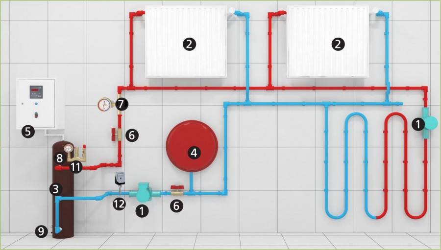 ТЭНовый котел нагревает воду в контуре посредством трубчатых нагревательных элементов. Его основная функция – генерировать тепло. Контур отопления практически ничем не отличается от схем, применяемых для газовых или твердотопливных котлов. При этом нужно правильное расположение батарей отопления в частном доме относительно окон. Если окон несколько, то радиаторы устанавливаются под каждым окном.