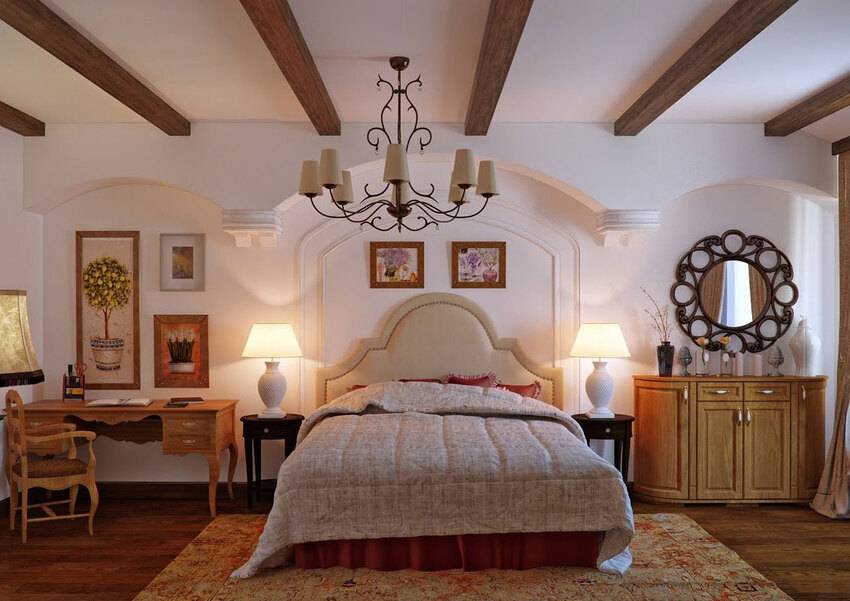 В спальнях, отделанных в таком стиле, самая главная деталь – это кровать. Она должна быть простой, насколько это возможно, но строго деревянной. Будет очень эффектно, если кровать украшена резными элементами. Но также допускаются и решения с коваными узорами на изголовье.
