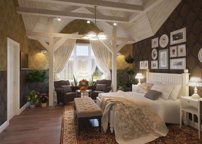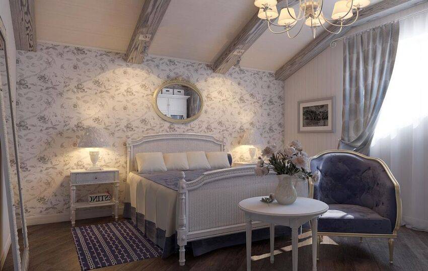 Мансарда – идеальное место для создания спальни в стиле прованс. В таком помещении обычно много больших окон и нет дорогой отделки.