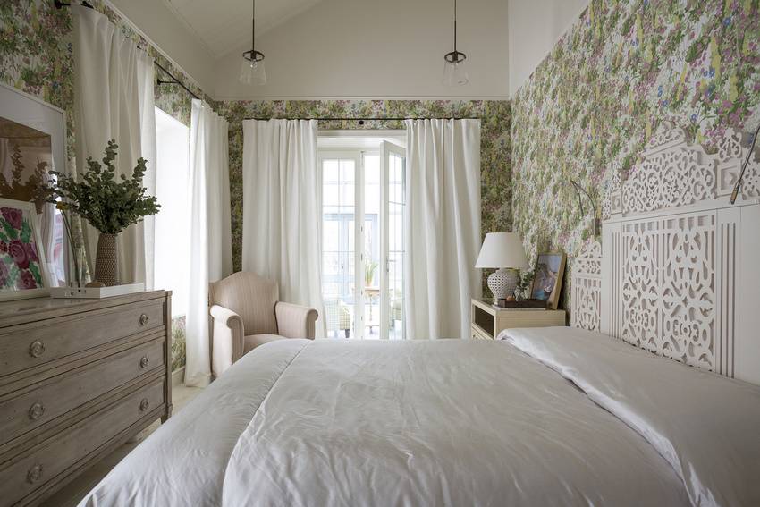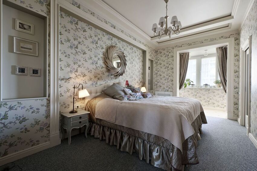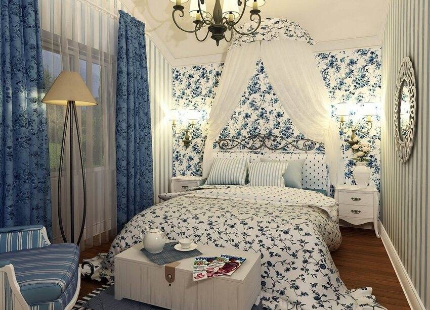 Прованский стиль обоев с цветным рисунком объединяет два основных цвета спальни