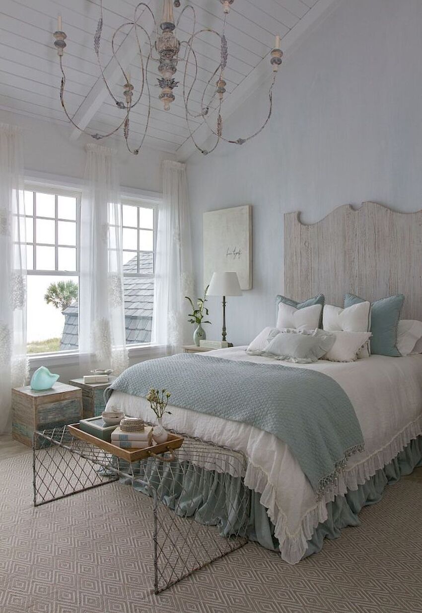 Подходящие цвета в текстиле — белый, молочный, бежевый, сливочный, а также «природные» — нежно-голубой, нежно-оливковый, нежный лавандовый и солнечный оттенки. Эти цвета, возможно, будут смотреться в интерьере выгоревшими, однако это не так — покой, который дарят покрывала, подушки и даже шторы, не сравнится ни с чем другим.