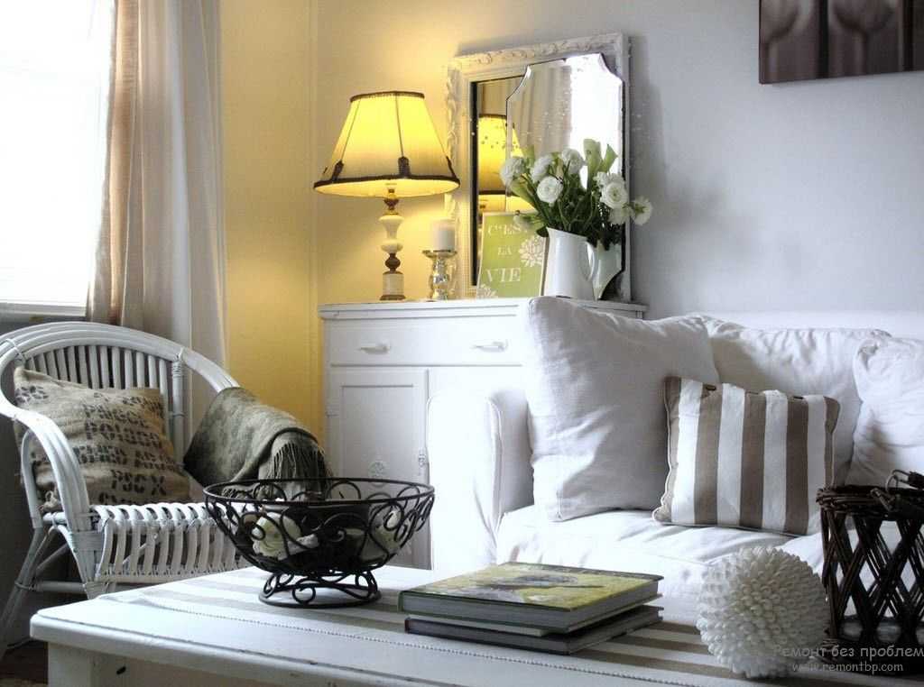 Интерьер гостиной может быть наполнен стилизованной мебелью. Диван и кресла, покрытые тканевым чехлом, могут быть однотонные или с изображением мелких цветов. Другой вариант оформления мебели – это наличие заметных потертостей, особенно эффектно такой прием выглядит на белом фоне.