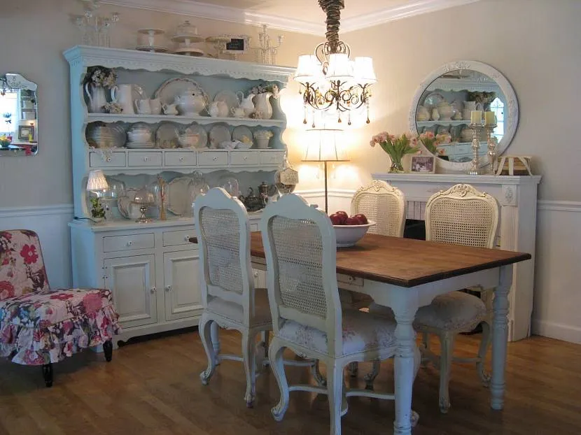 Аксессуары и посуда из керамики или фарфора может иметь декоративные потертости и изображения цветов, а кружевные скатерти и подушки для стульев завершат образ.