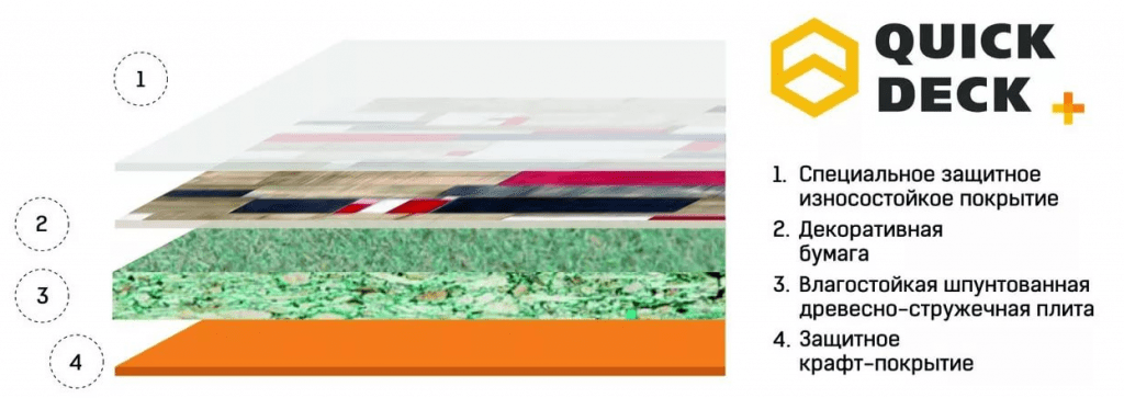 Идеальный материал для черновой отделки стен, пола, сухой сборной стяжки, такую сборную стяжку можно применять во всех типах помещений. Для изготовления плит ДСП используется влагостойкая древесно-стружечная плита повышенной плотности с последующим добавлением в нее двух связующих элементов – парафин и меламин. Также ДСП QuickDeck имеет дополнительную защиту – плотное Крафт-покрытие, и становится плитой “Премиум-класса”, благодаря чему плита еще больше защищена от проникновения воды и приобретает более высокий класс экологичности. Строительные плиты QuickDeck шпунтованы по периметру, что позволяет достичь высокой скорости и простоты сборки.