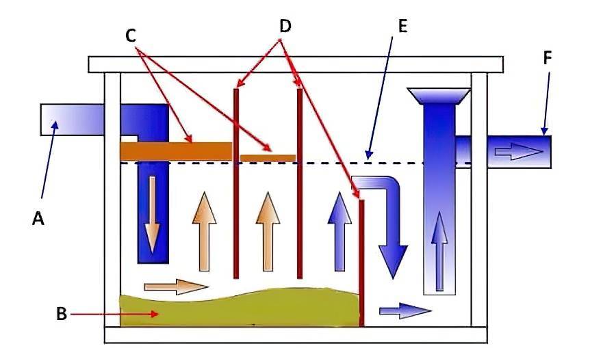 Это специальные резервуары, служащие для удаления жиров, содержащихся в стоках. Упрощенный чертеж такого устройства продемонстрирован ниже.