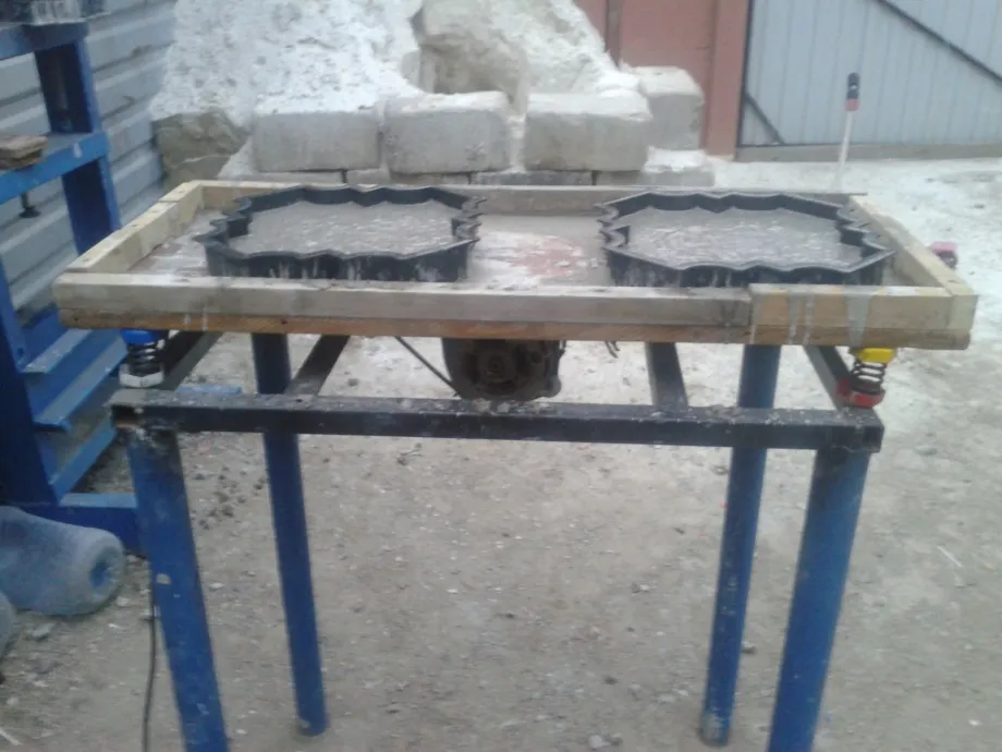 Грубо говоря, вибропресс — это мощнейший стол, столешница которого подвешена на пружинах либо иным методом. Вибрация столешницы происходит за счет смещения центра масс в эксцентрике, который прикреплен к выходному валу электродвигателя.