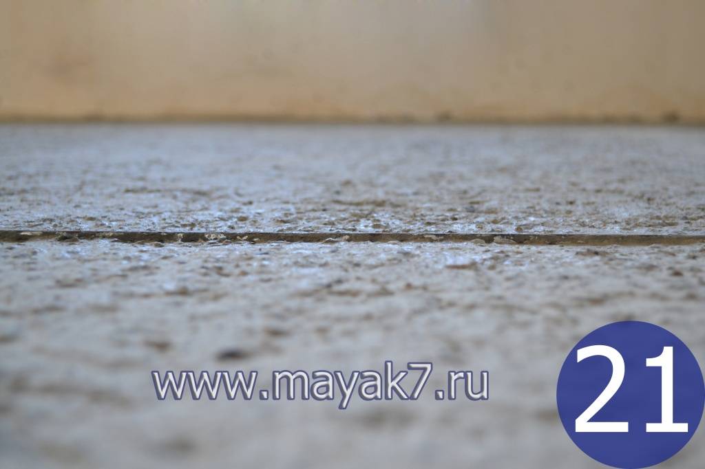 По условию заказчика, мы готовили раствор для стяжки пола из цемента и отсева (в пропорции 1х4). Но, как правило, стяжку пола заливают раствором (1х4) из цемента и песчано-гравийной смеси (ПГС). При заливке стяжки пола с применением ПГС вся работа выполняется в один прием. В этом случае поверхность получается однородной и не требует дополнительного выравнивания, в отличие от работ с отсевом. Консистенция раствора с отсевом, для первичной заливки стяжки, не должна быть густой. (см. фото 17, 18, 19, 20) Это необходимо для того, чтобы при высыхании уровень стяжки был ниже маяков на 2-4 мм. (см. фото 21) При заливке стяжки выравнивание раствора осуществляется правилом 2,5м, перемещая его влево и право и протягивая его на себя. Крепеж «Ушастик» обеспечивает надежную фиксацию маяков при любой толщине стяжки пола.