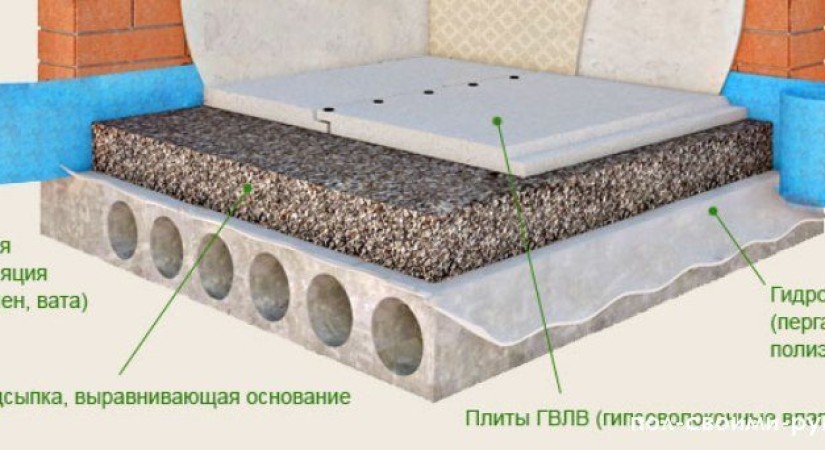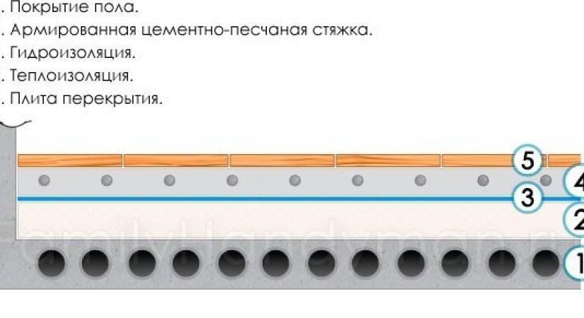 В качестве дополнительной теплоизоляции и шумоизоляции под слой бетона или другого состава укладывают утеплитель.
