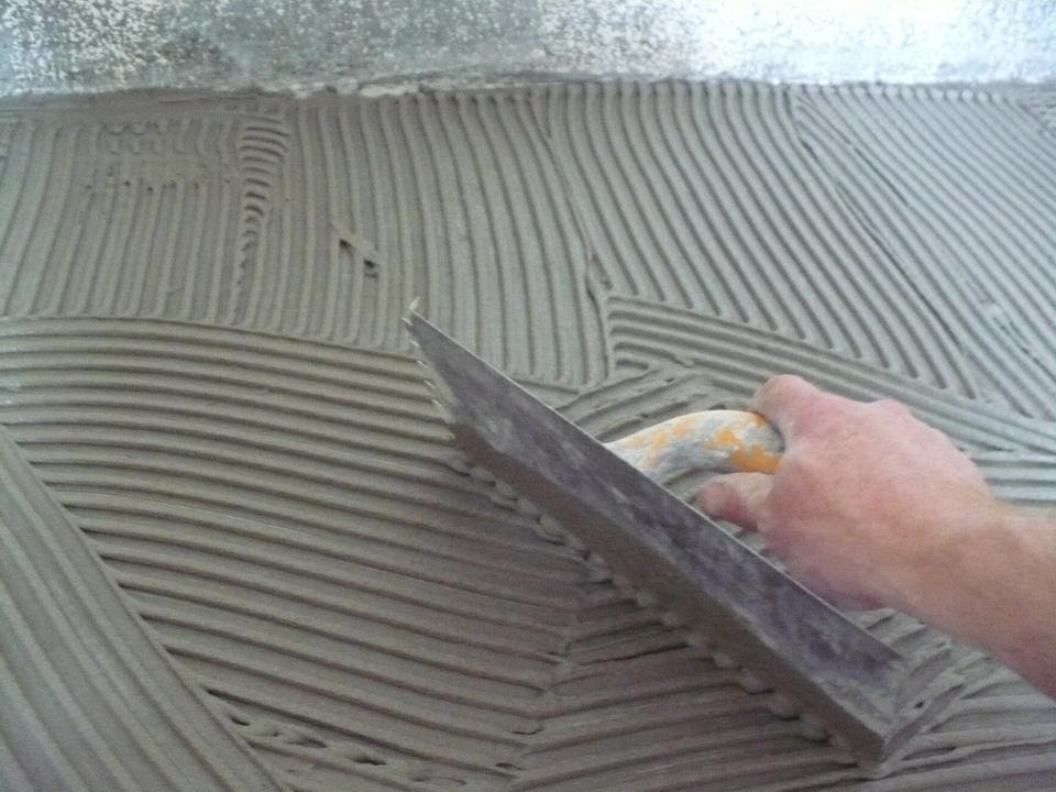 Процесс начинается с установки маяков по уровню. Далее наносим ЦПС при помощи зубчатого шпателя. Смесь необходимо втирать в поверхность пола.