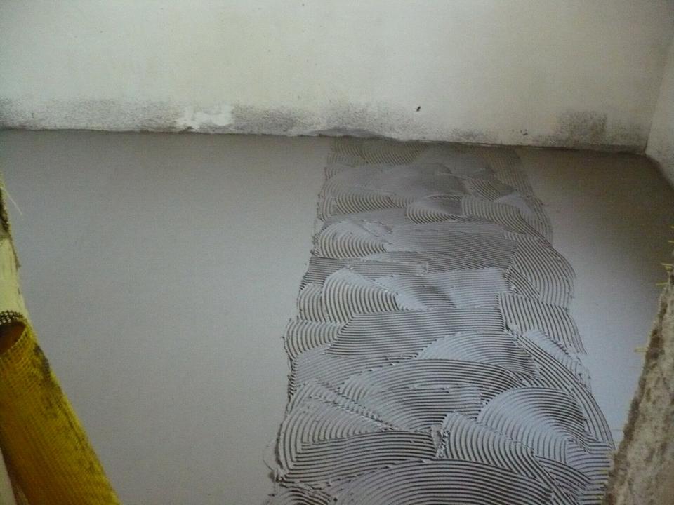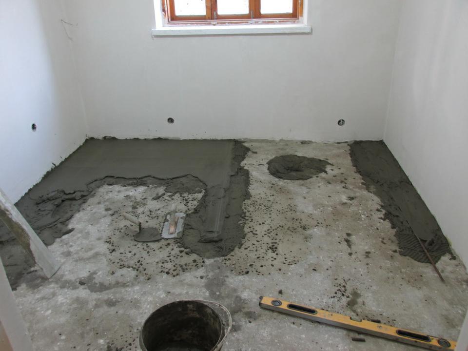 Стяжку толщиной 30-40 мм выполняют из цементно-песчаного раствора, при толщине более 40 мм лучше устраивать бетонную стяжку. Если финишное покрытие – кафель, можно ограничиться одним слоем стяжки, в других случаях желательно поверх черновой стяжки выполнить финишный выравнивающий слой.