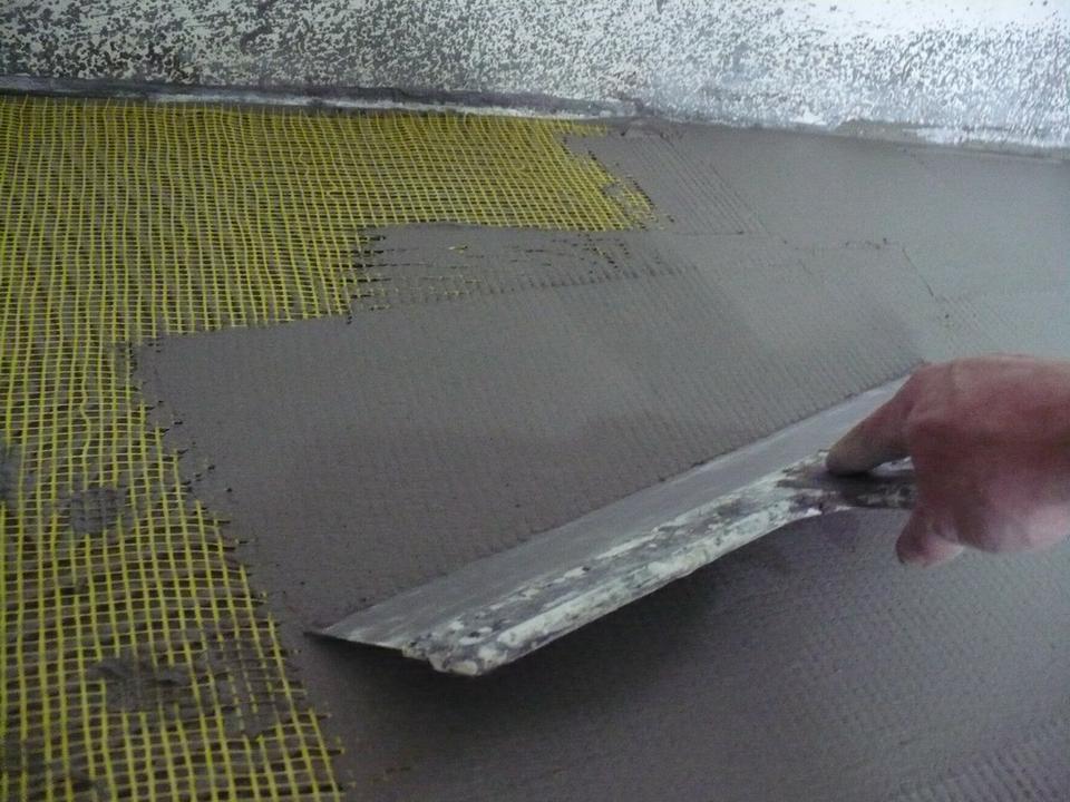 Для начала выполняем такие же работы с ЖС, то есть грунтуем поверхность. Затем заготавливаем цементно-песчаную смесь (ЦПС), в состав которой входит просеянный песок (крупнозернистый), цемент, плиточный клей в пропорции 3×1х1 (три части песка, одна цемента, одна плиточного клея).